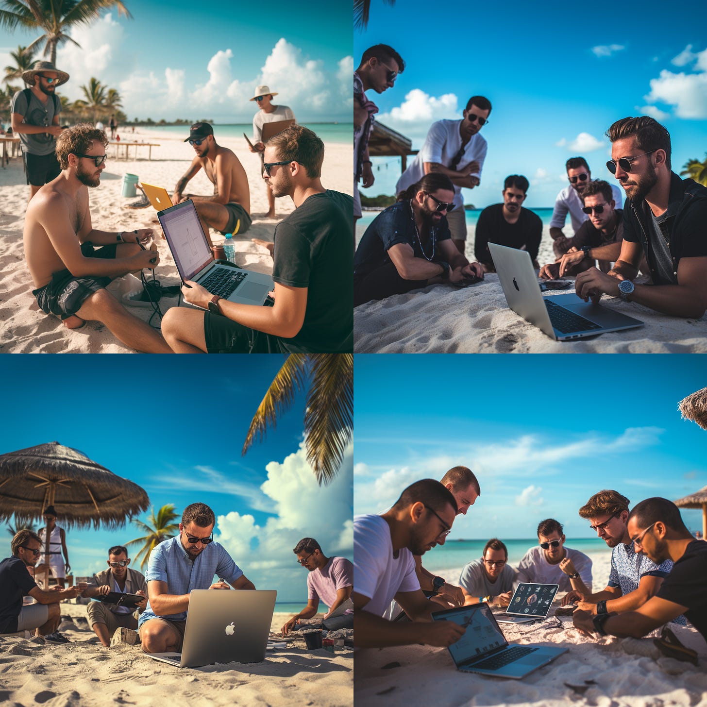 (Midjourney’s four suggestions when asked for workers from a crypto startup working on a beach in the Bahamas. Making them all male was very much Midjourney’s own idea, not the prompt)