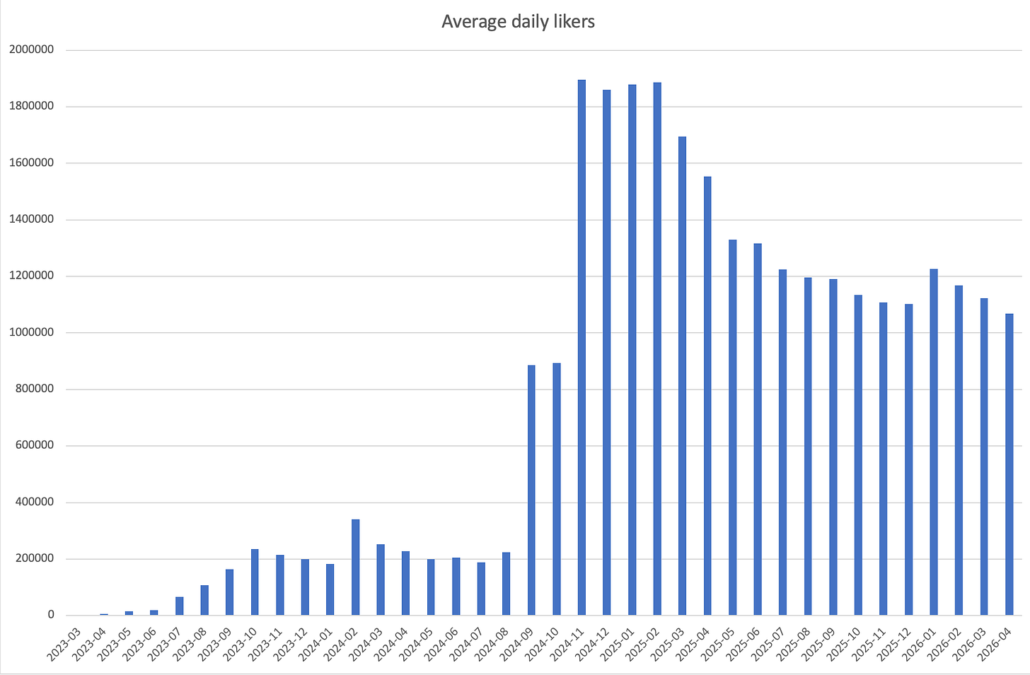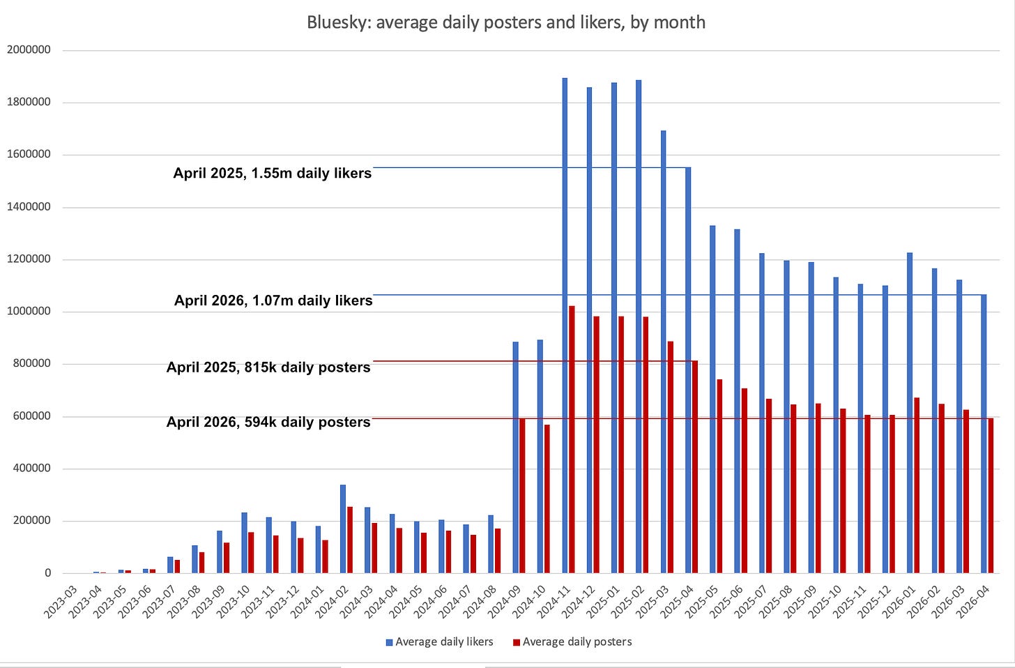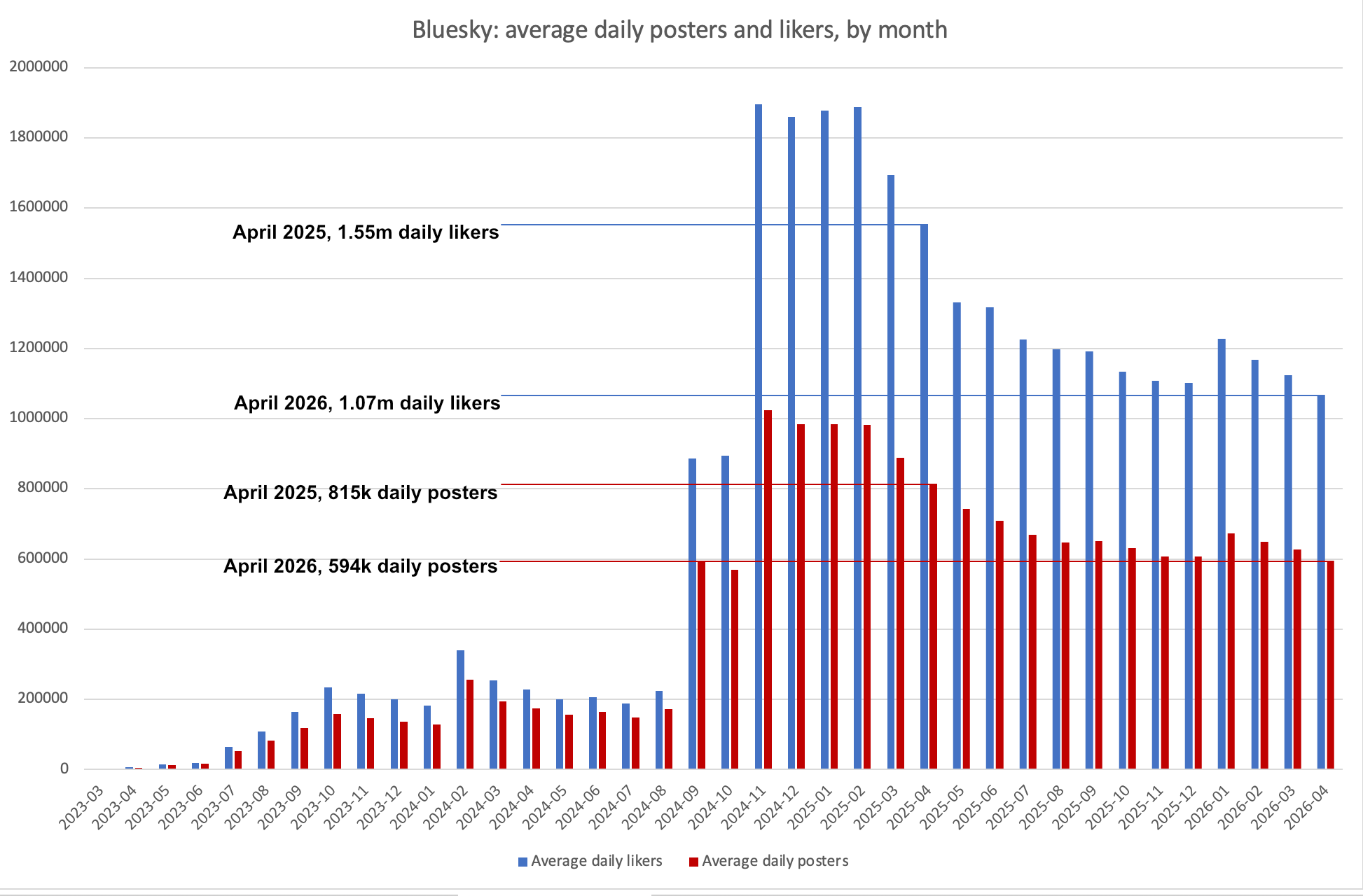 In the first few days of April 2026, average daily posters had fallen to the level of September 2024 – handing back everything the site had gained since Trump’s election win. The likers figure that I used in the original post was actually the more generous metric to Bluesky, as it is at least still higher than during the Biden years.