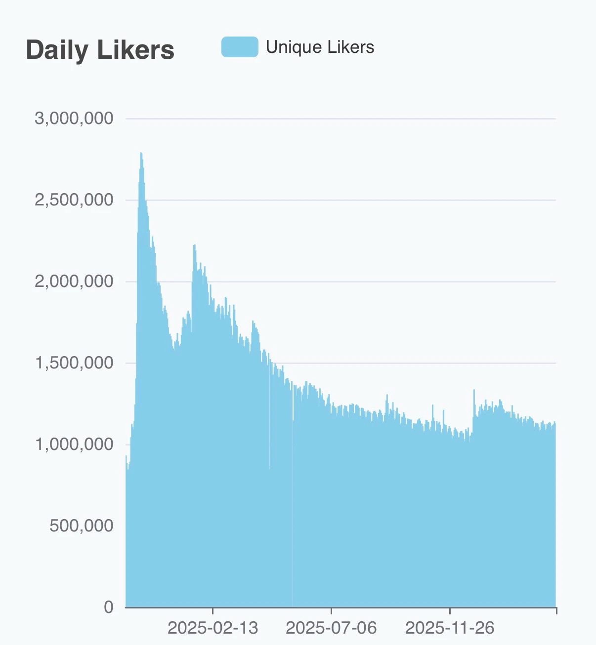 The third critique was why I was using “daily likers” as a measure, and whether that is meaningful. The reality is there’s no one perfect metric, but for Bluesky we have access to data on how many unique individuals like a post every day, and how many unique people post every day, helpfully aggregated at https://bsky.jazco.dev/stats.